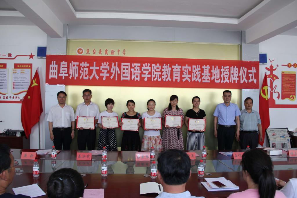 外国语学院相关负责人向鱼台县实验中学的六位优秀指导教师颁发了“行业导师”聘书,聘请他们为外国语学院的外聘教师。