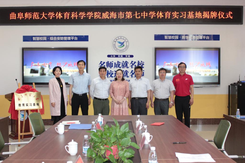 体育科学学院院长曹莉教授与威海七中校长谷娥签署了教育实习基地协议,并与环翠区教体局局长公佩宏为实习基地揭牌。