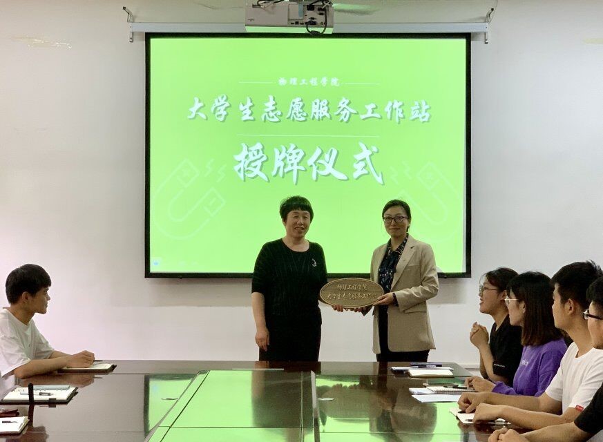 活动中,三名志愿服务团队负责人分别做了汇报发言;杨志英为物理工程学院大学生志愿服务工作站授牌,工作室主持人王琼接受授牌。