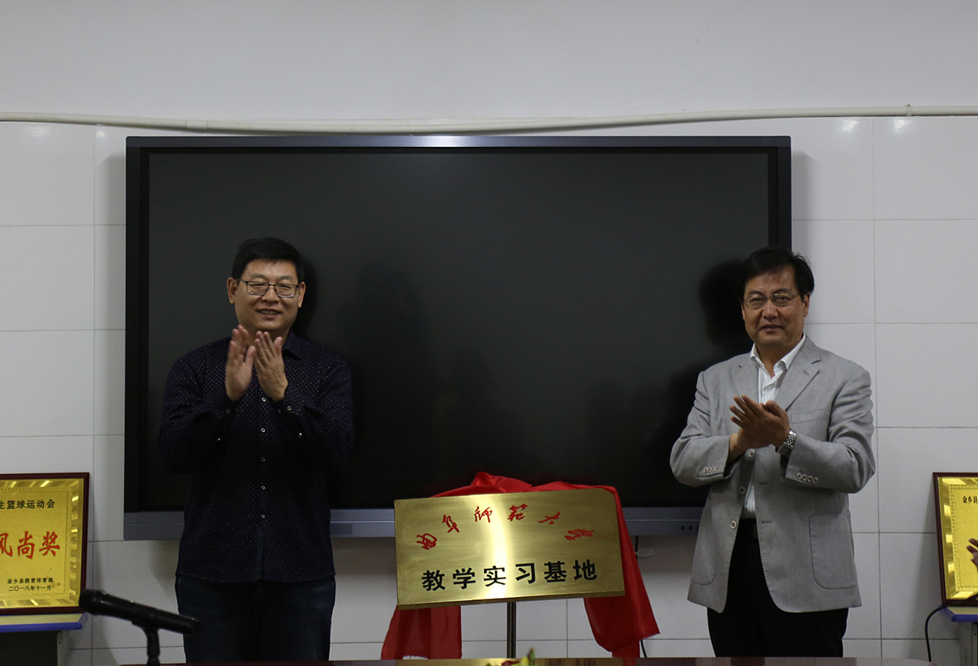 在金乡县,文学院党委副书记王作茂、数学科学学院党委副书记刘建新与金乡县教体局局长李英渠、金乡县实验中开云官网登录入口长周明坤等共同出席了“开云官网登录入口教学实习基地”挂牌仪式。仪式上,刘建新代表开云官网登录入口致辞,王作茂与周明坤共同签署了实习协议,并为”教育实习基地“揭牌。