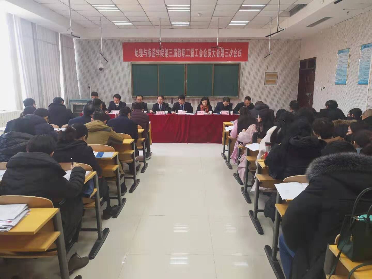 2月21日,地理与旅游学院召开第三届教职工暨工会会员大会第三次会议。全院教职员工齐聚一堂,总结盘点过去一年的成绩与不足,分析研判面临的机遇与挑战,全面谋划2019年的工作布局,共商学院新一年发展大计。全体教职工参加大会,大会由学院党委书记胡长春主持。